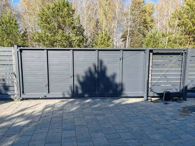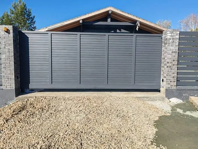 Заказал заводские откатные ворота с заполнением как и на гаражных воротах, чтобы все сочеталось. Смотрятся добротно, теперь открываю с одного пульта. Доволен покупкой, монтаж качественный, работают хорошо.